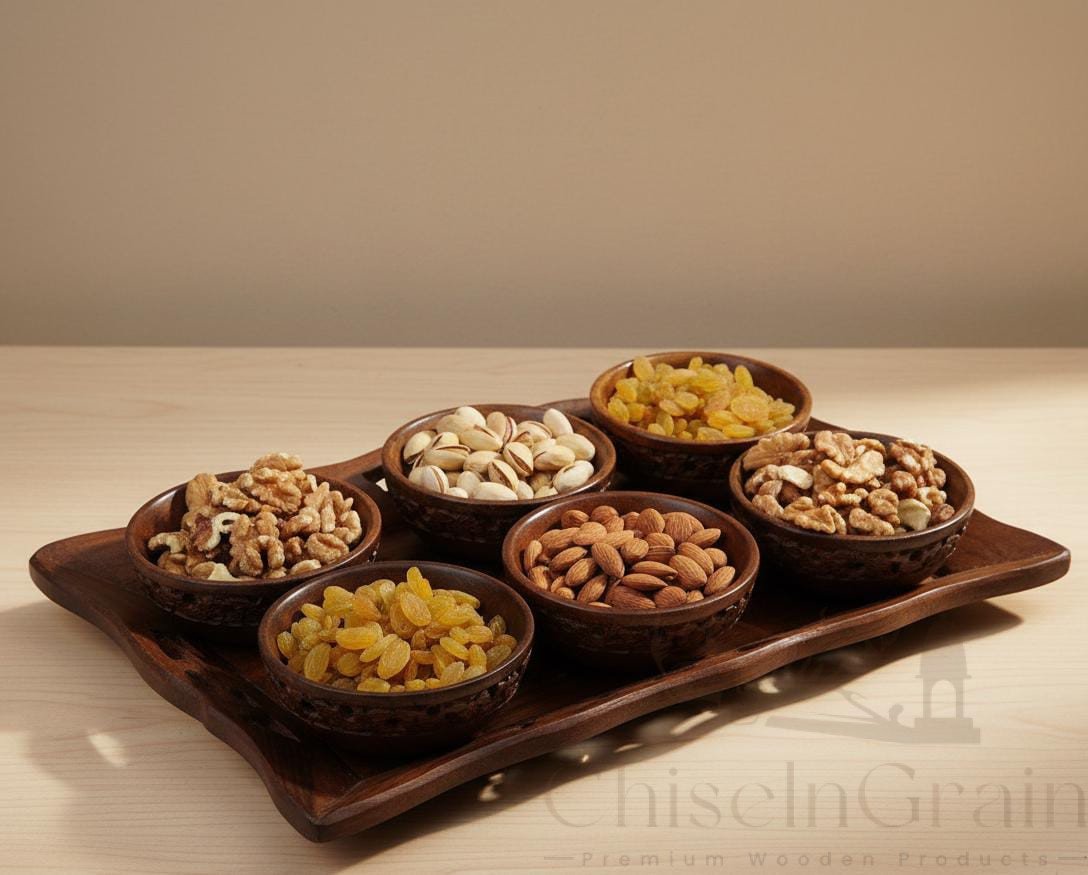 Elevate your hosting game with this beautifully handcrafted 6-bowl wooden dry fruit tray set. Perfect for serving dry fruits, nuts, or snacks during festivals, family gatherings, or special occasions, this rustic wooden set adds a warm, artisanal charm to any table. Each of the six bowls sits snugly on a polished, carved tray, offering both beauty and function in equal measure.